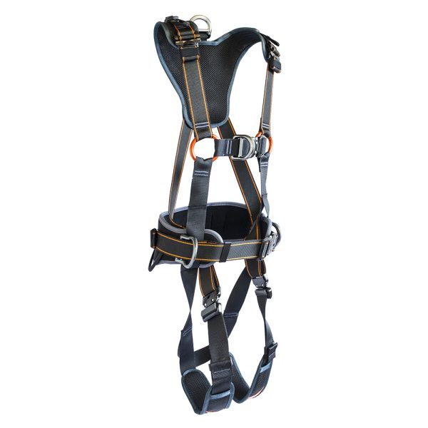 The breathable low profile back panel and padded waist belt provide support and protection while climbing. The padded waist belt is fitted with two side D’s for work positioning. The back panel also helps to hold the harness in shape, reducing tangling and aiding orientation.